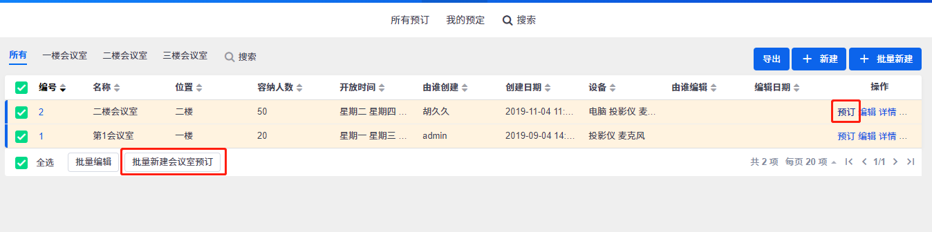 全选后,批量创建会议室的预定按钮就是显示,点击也就可以批量创建会议室预订。