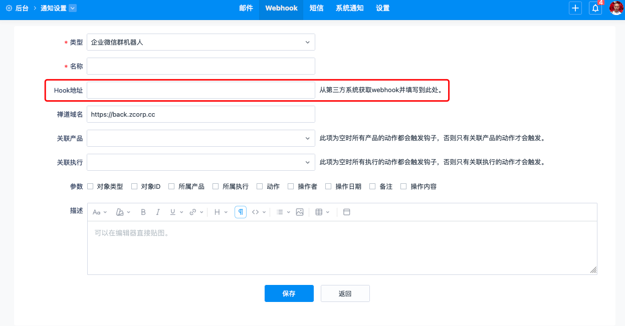 把这个Webhook地址复制,填写到禅道后台--通知--Webhook,添加“企业微信”类型的Webhook的地址栏,点击保存即可。
