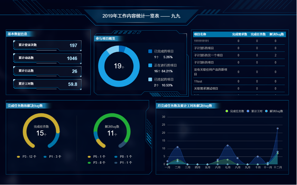 列出当前用户每月完成任务数及累计工时和解决Bug数,以曲线图的方式呈现。