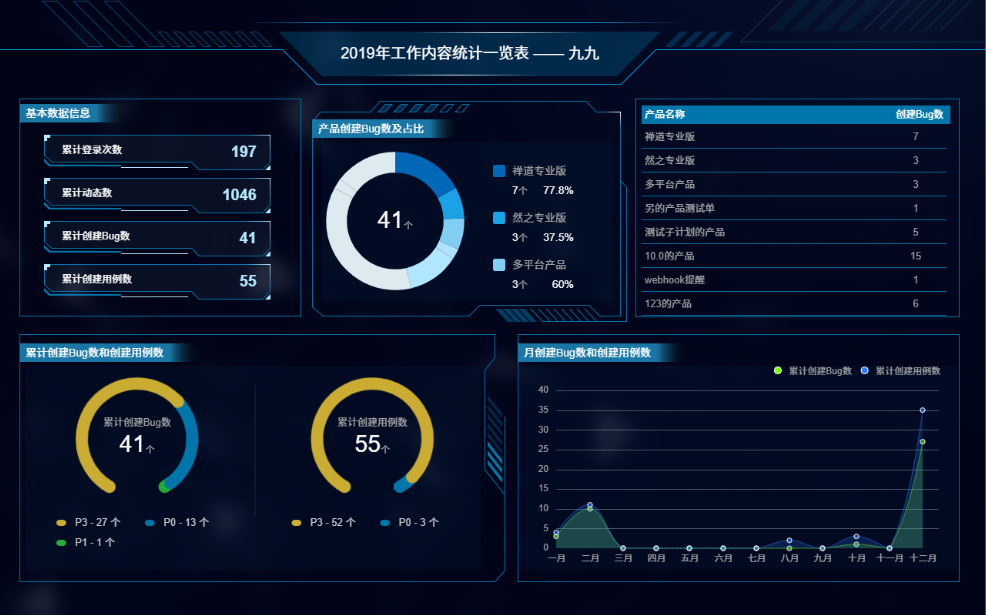 基本数据信息区块包含:当前用户年度内累计登录次数、累计动态数、累计创建Bug数、累计创建用例数。