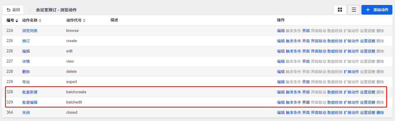 自定义流程的动作增加了批量新建和批量编辑的操作功能,可以到自定义流程的动作列表里查看。