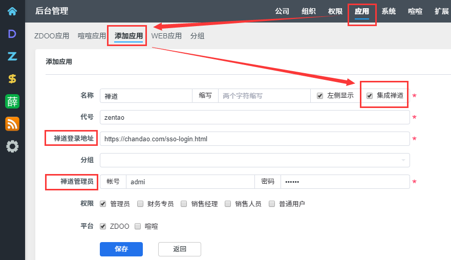 在ZDOO后台管理---应用---添加应用,勾选集成禅道。