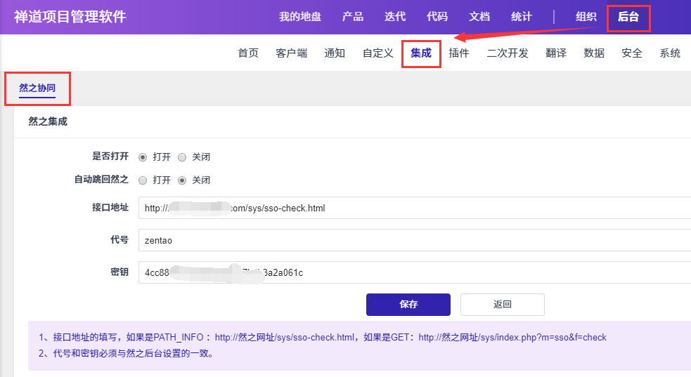 注:禅道10.6后,ZDOO协同的集成设置位置做了调整,由原来的后台——然之集成改为后台——集成——然之协同。