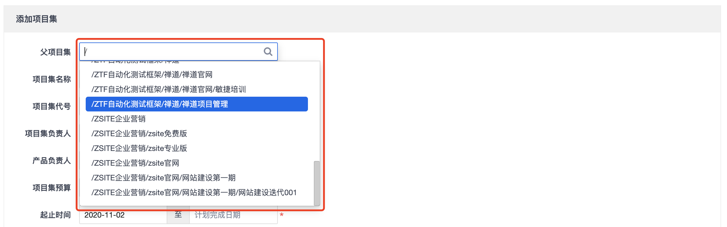 2. 添加项目集时选择父项目集