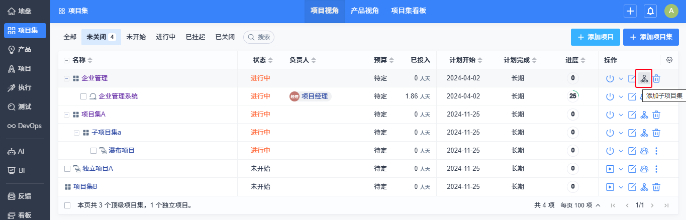 通过项目集列表,可以通过操作区域中的子项目集为项目集拆分子项目集。