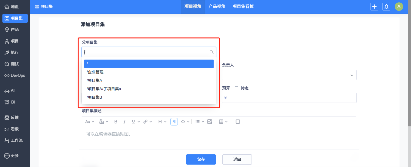 也可以点击项目集列表右上角的添加项目集,在录入项目集的信息中选择所属的父项目集。