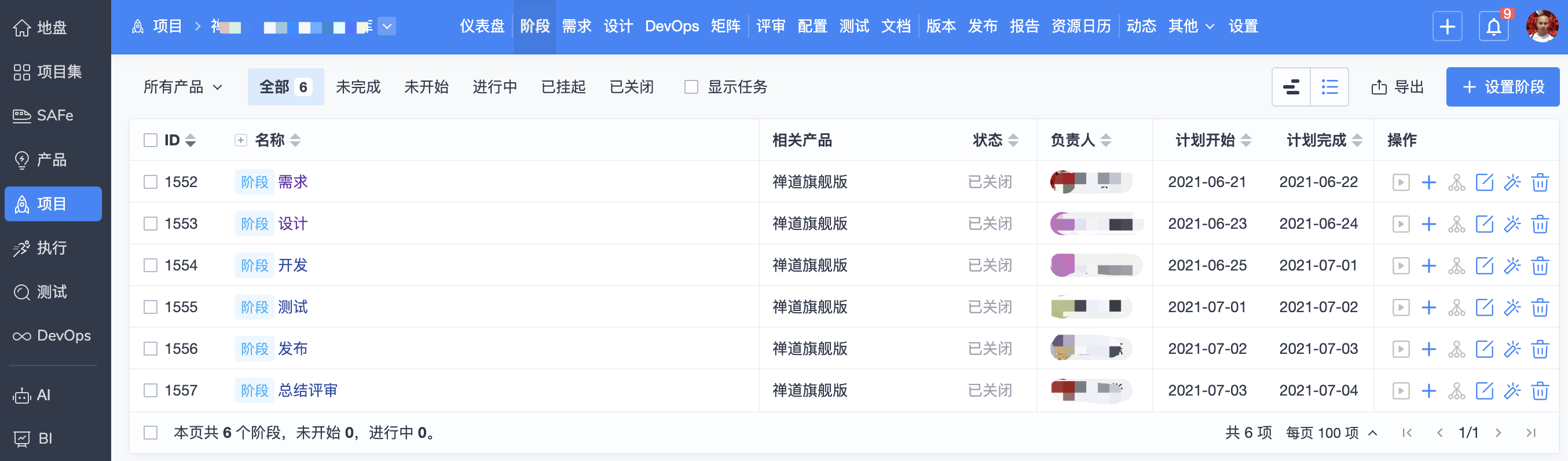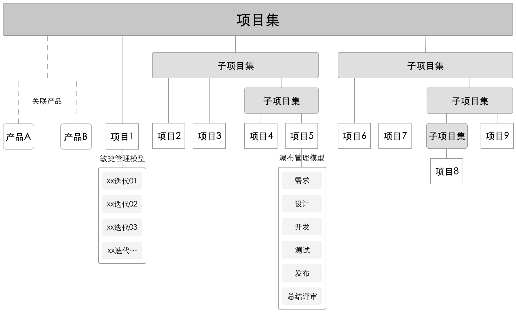 瀑布模型的项目支持瀑布式项目管理,一个项目下包含多个阶段:需求、设计、开发、测试、发布、总结。