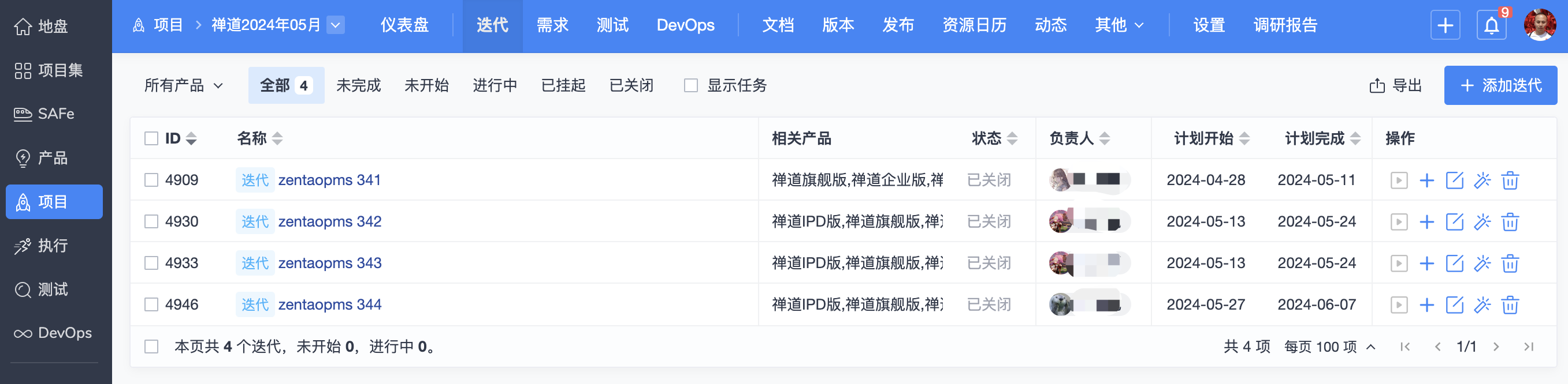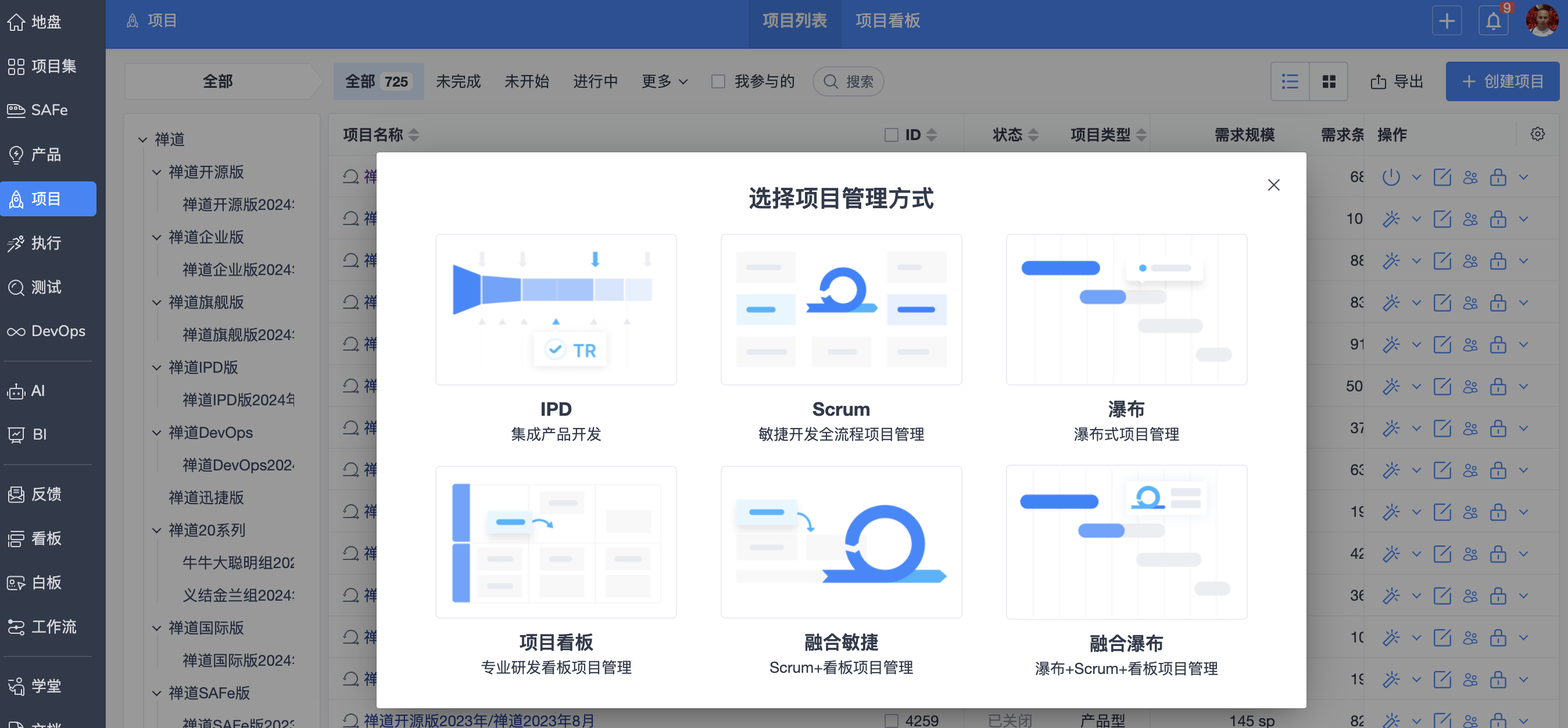 在禅道中,不同的项目可以支持不同的管理模型,目前支持:Scrum、瀑布、项目看板、融合敏捷、融合瀑布、IPD等多种项目管理模型,以后我们还会增加灵活的自定义模型。