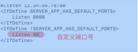 3. 端口号修改,搜索 "Listen 80" ,将默认80端口修改为其他端口(注意不要与其他服务端口号冲突),修改后需重启Apache服务。