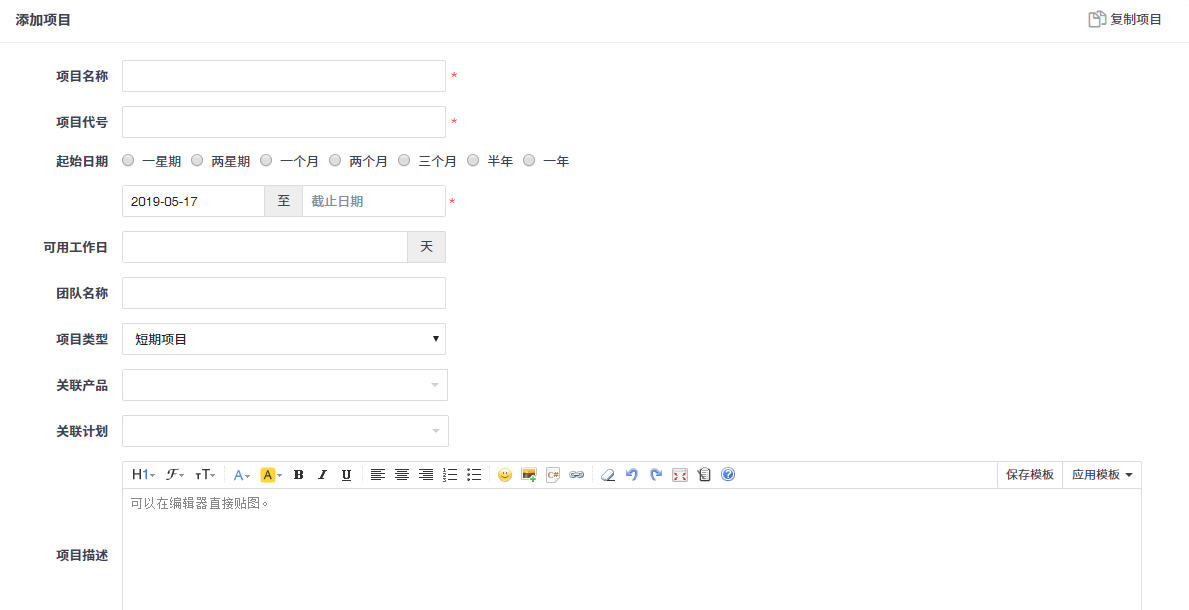 进入项目添加的页面后,在这个页面设置项目名称、代号、起止时间、可用工作日、团队名称、项目目标和项目描述等字段。其中关联产品是可以为空的。