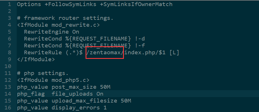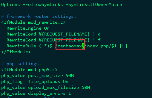 修改zentaopms/www/下的.ztaccess文件,第8行的zentao改为zentaomax