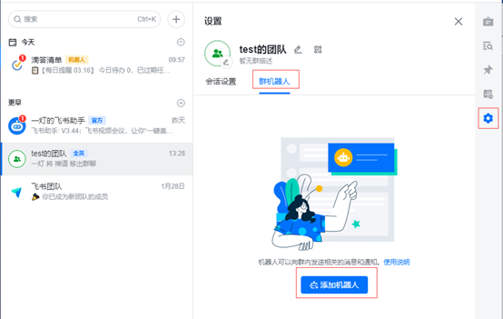 在飞书客户端中选择一个需要配置机器人的群