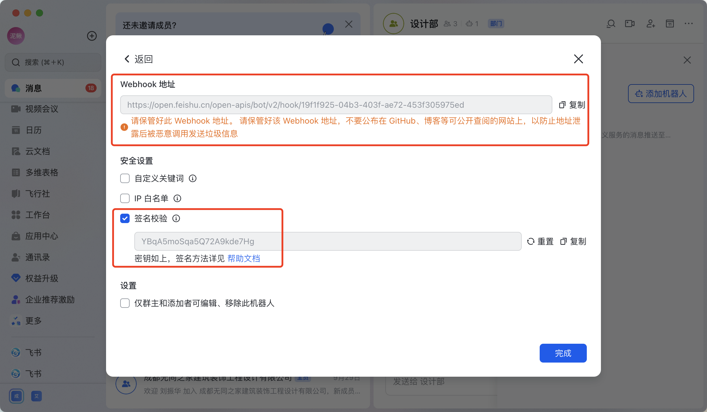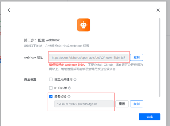 记录好Webhook地址和签名校验秘钥
