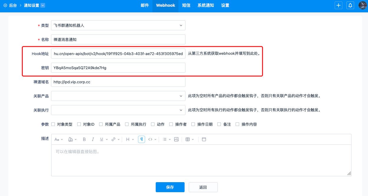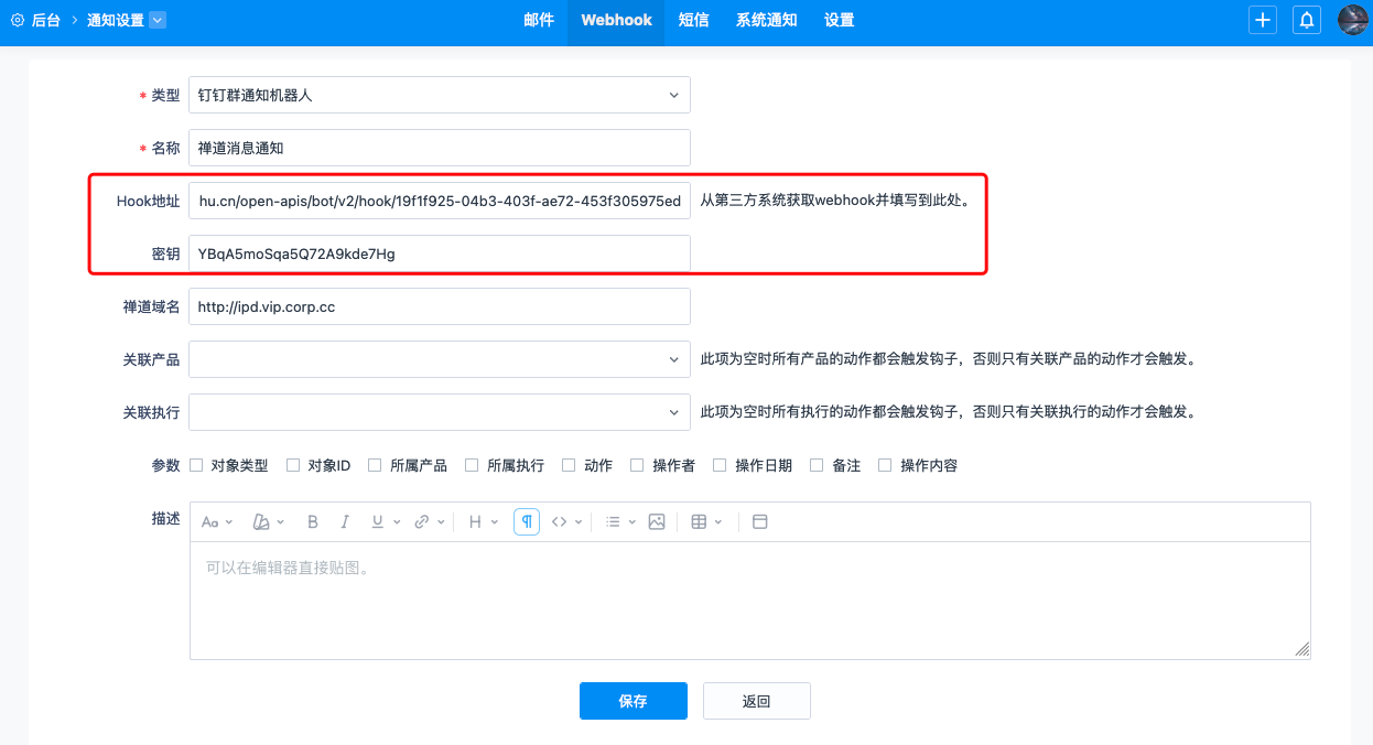 2、将Webhook地址和签名秘钥添加到禅道的hook地址和密钥