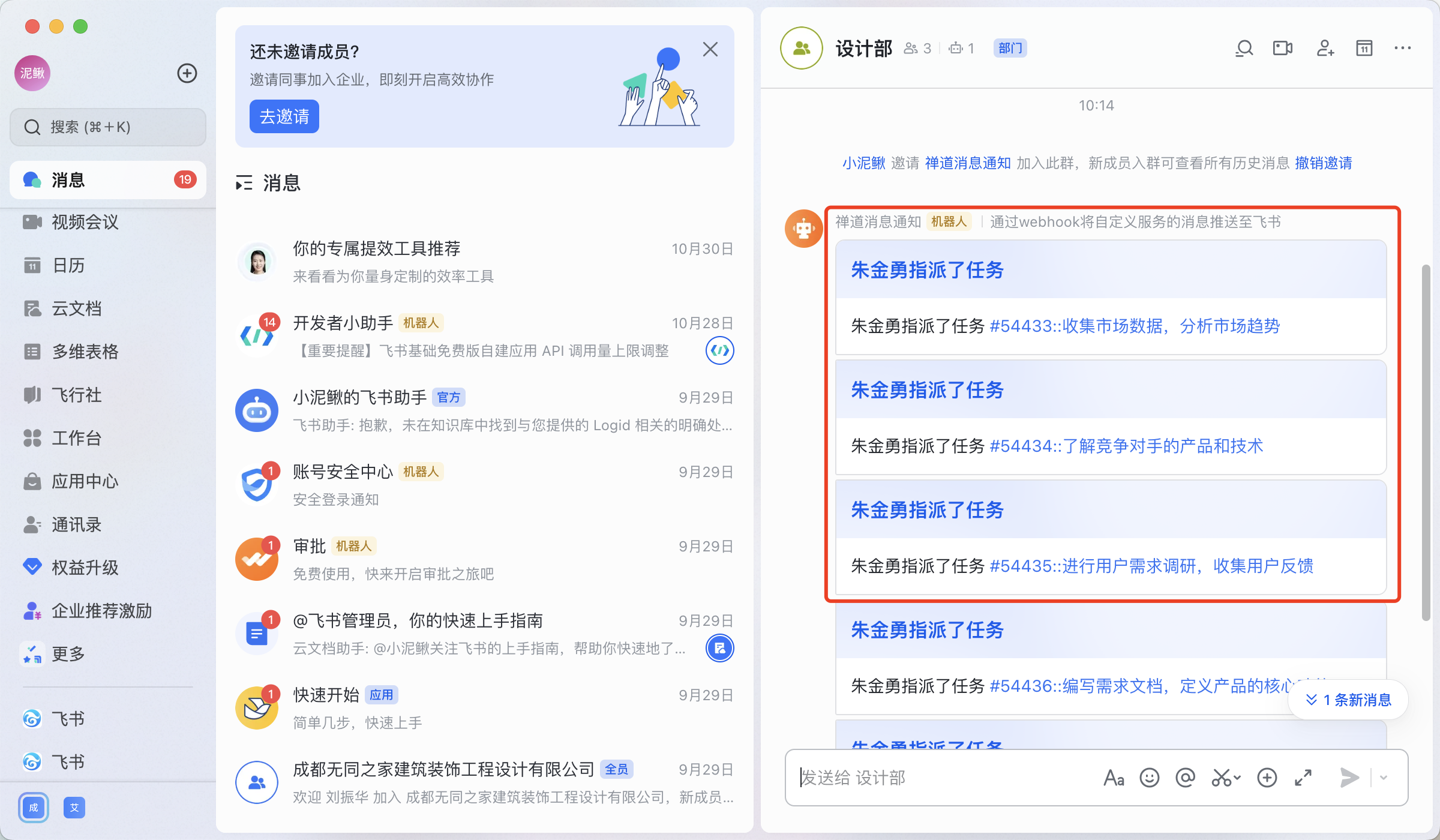 在禅道中执行相关触发消息通知的动作,进入飞书对应的群中,可以查看到机器人消息通知。