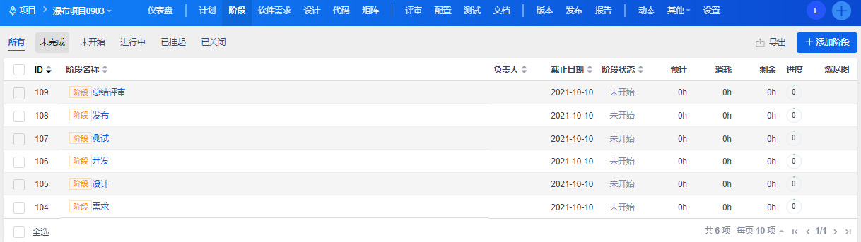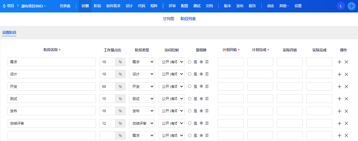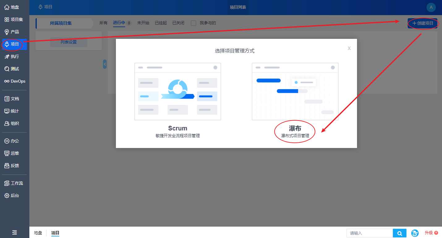 项目管理方式点击选择 瀑布(瀑布式项目管理),填写好信息,点击保存即可。