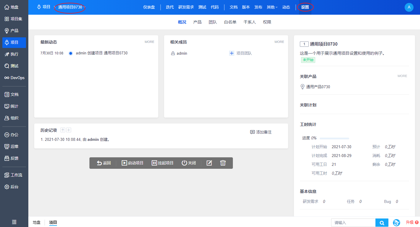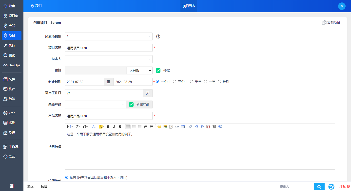 在项目模块下,点击“创建项目”。你可以为项目集创建一个所属项目或者创建一个独立项目。注意设置“访问控制”、“权限控制”、“任务时间限制”(企业版功能)、“关联需求概念设置”。