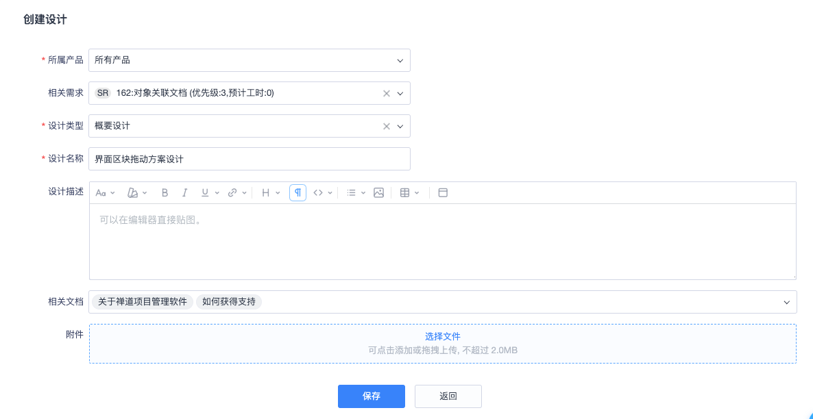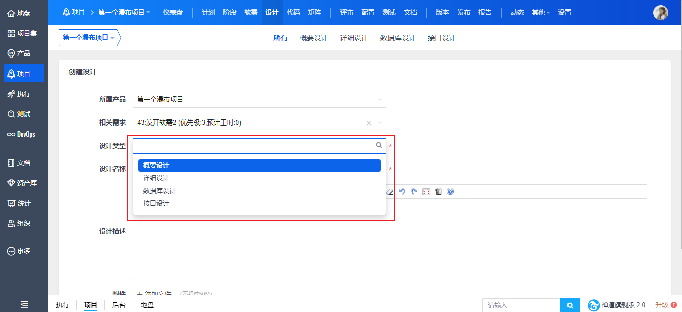 如已关联需求,可以从下拉菜单中选择“相关需求”。可以针对瀑布项目某一个需求编写设计文档。