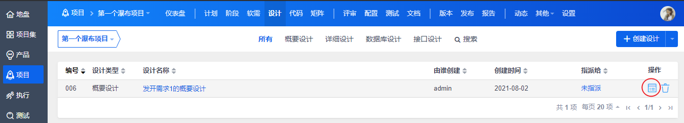 点击“提交”后,可在设计列表中看到刚刚创建的概要设计。