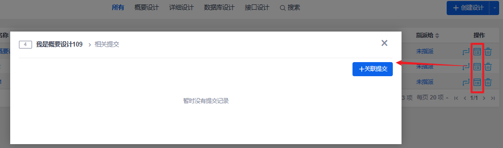 点击查看关联提交按钮,进入设计相关提交查看页面。