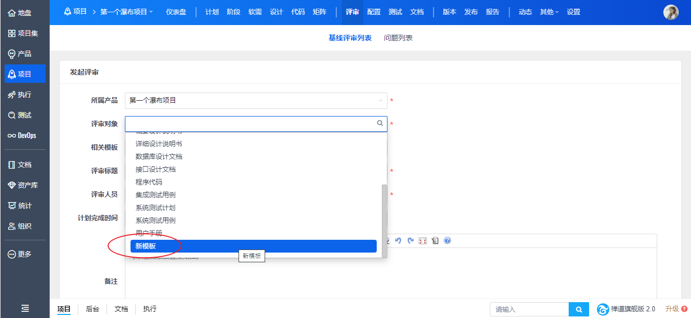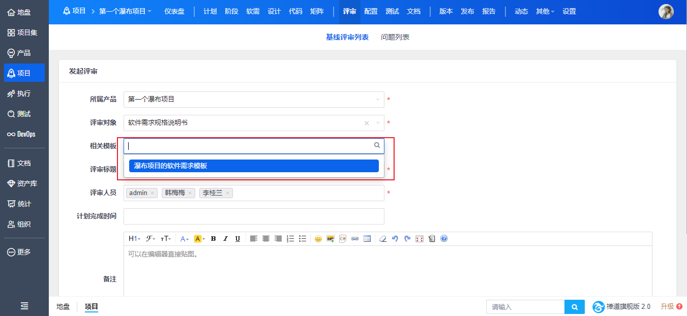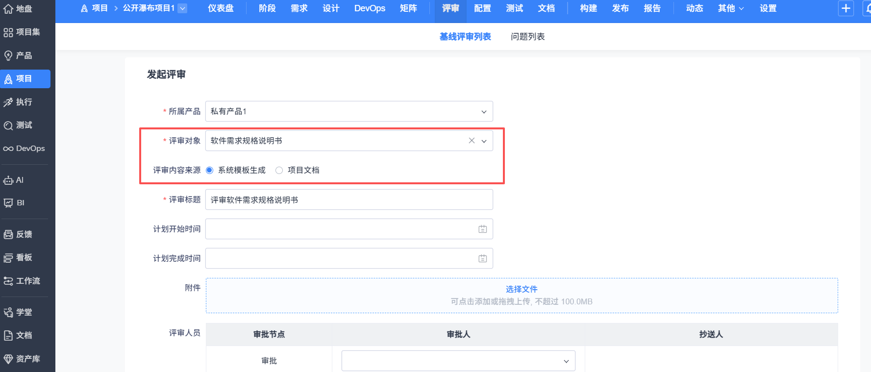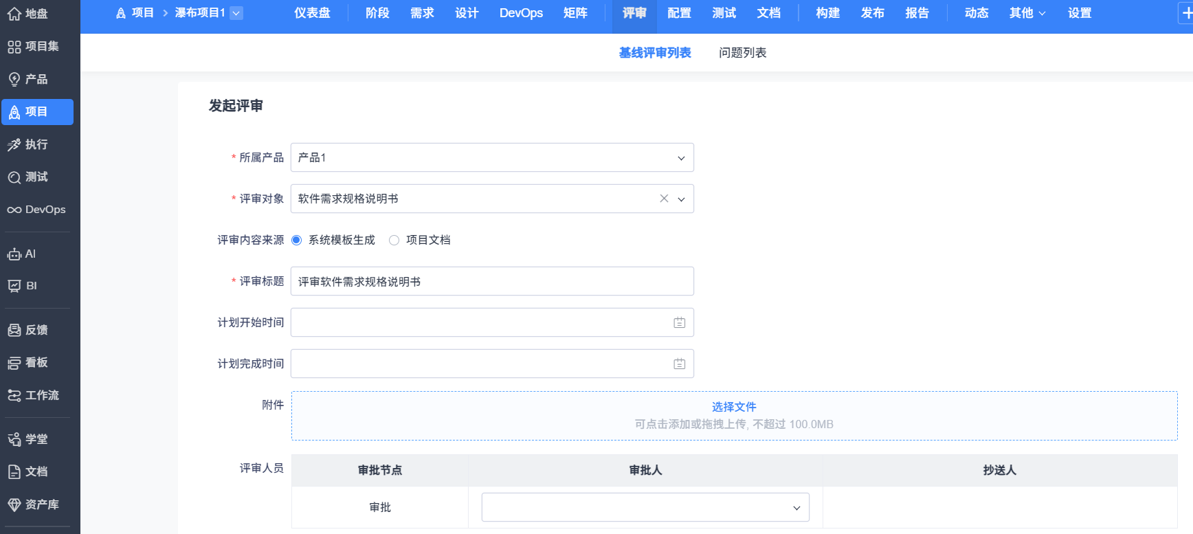 进入一个瀑布项目,点击“评审”-“发起评审”。选择评审对象,例如“软件需求规格说明书”,评审内容来源选择“系统模板生成”。