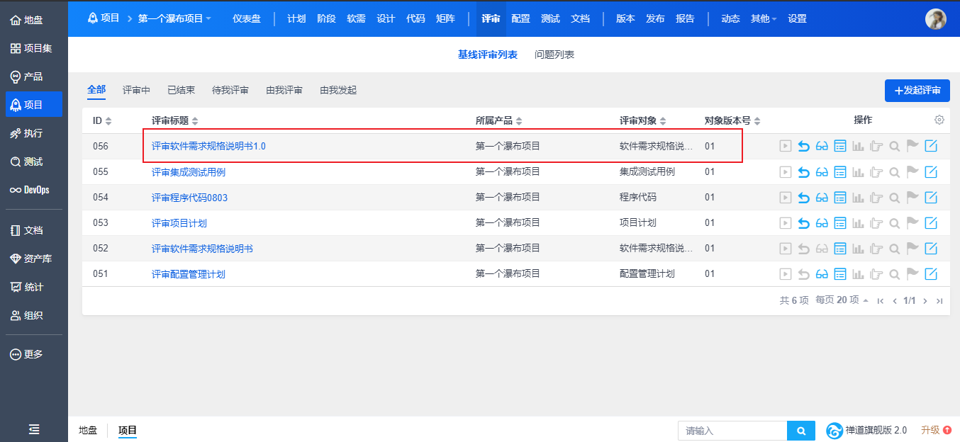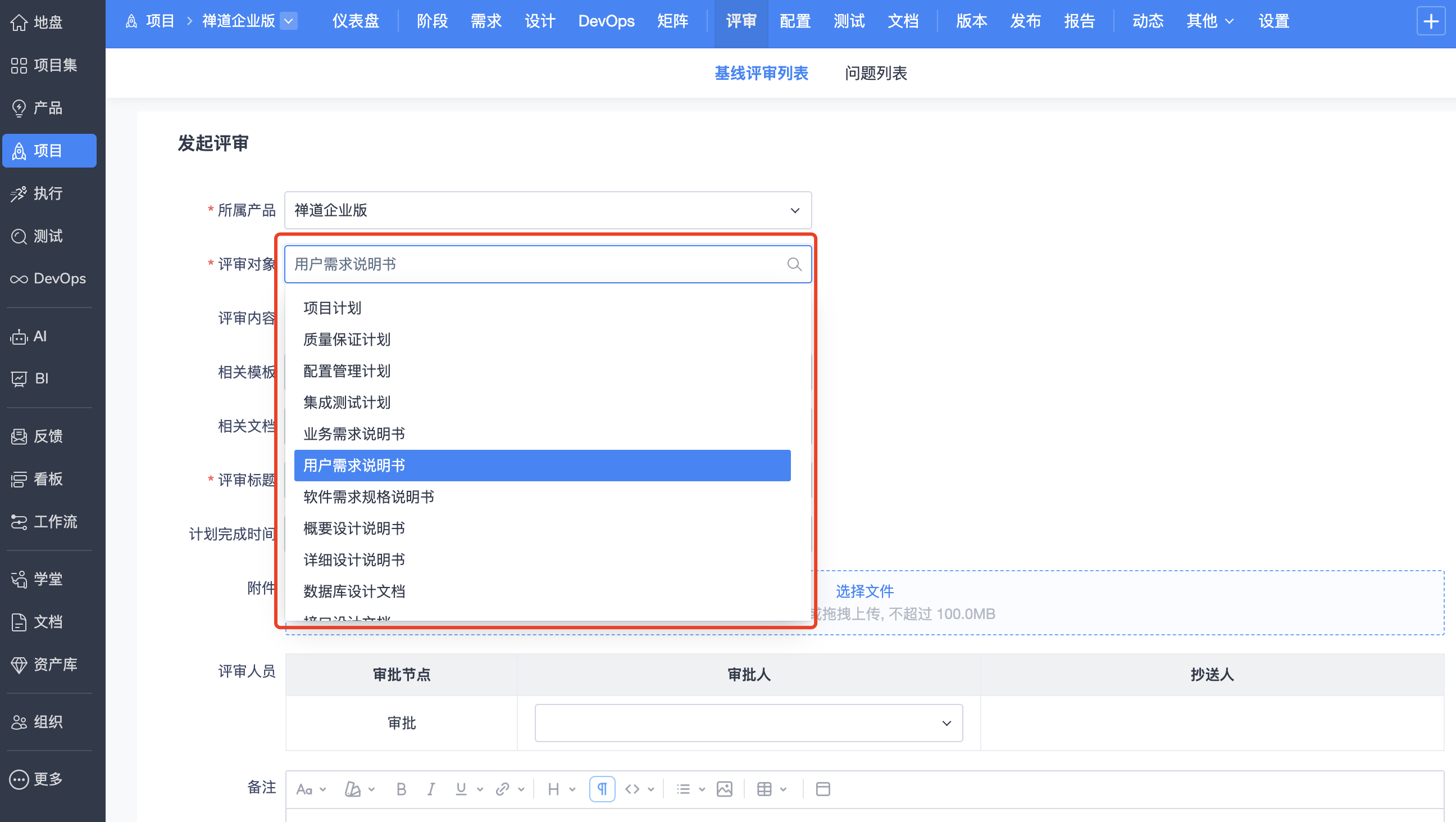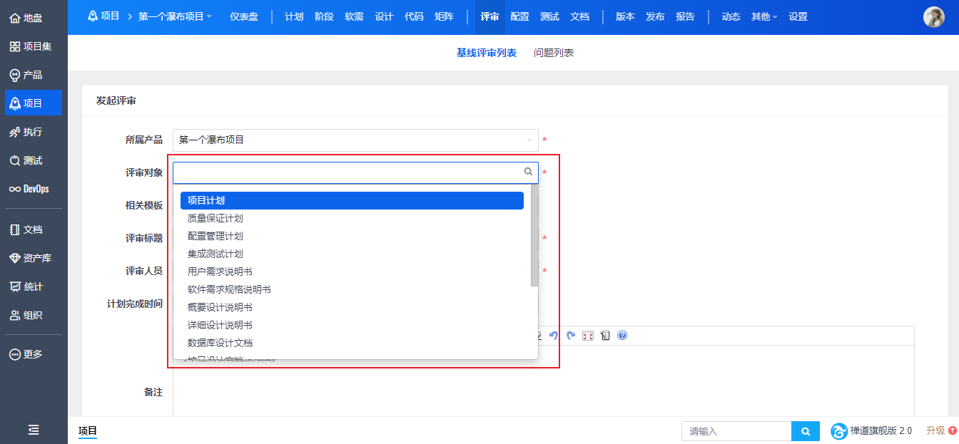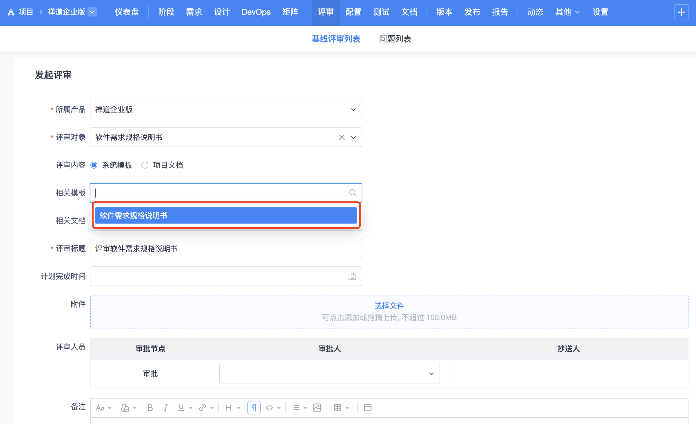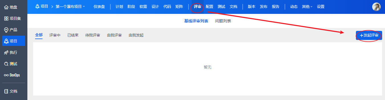 进入一个瀑布项目,点击“评审”-“发起评审”。选择评审对象,例如“软件需求规格说明书”,评审内容来源选择“系统模板生成”。