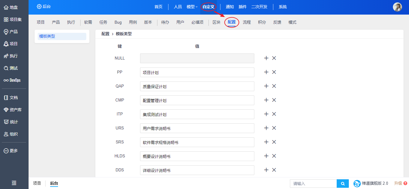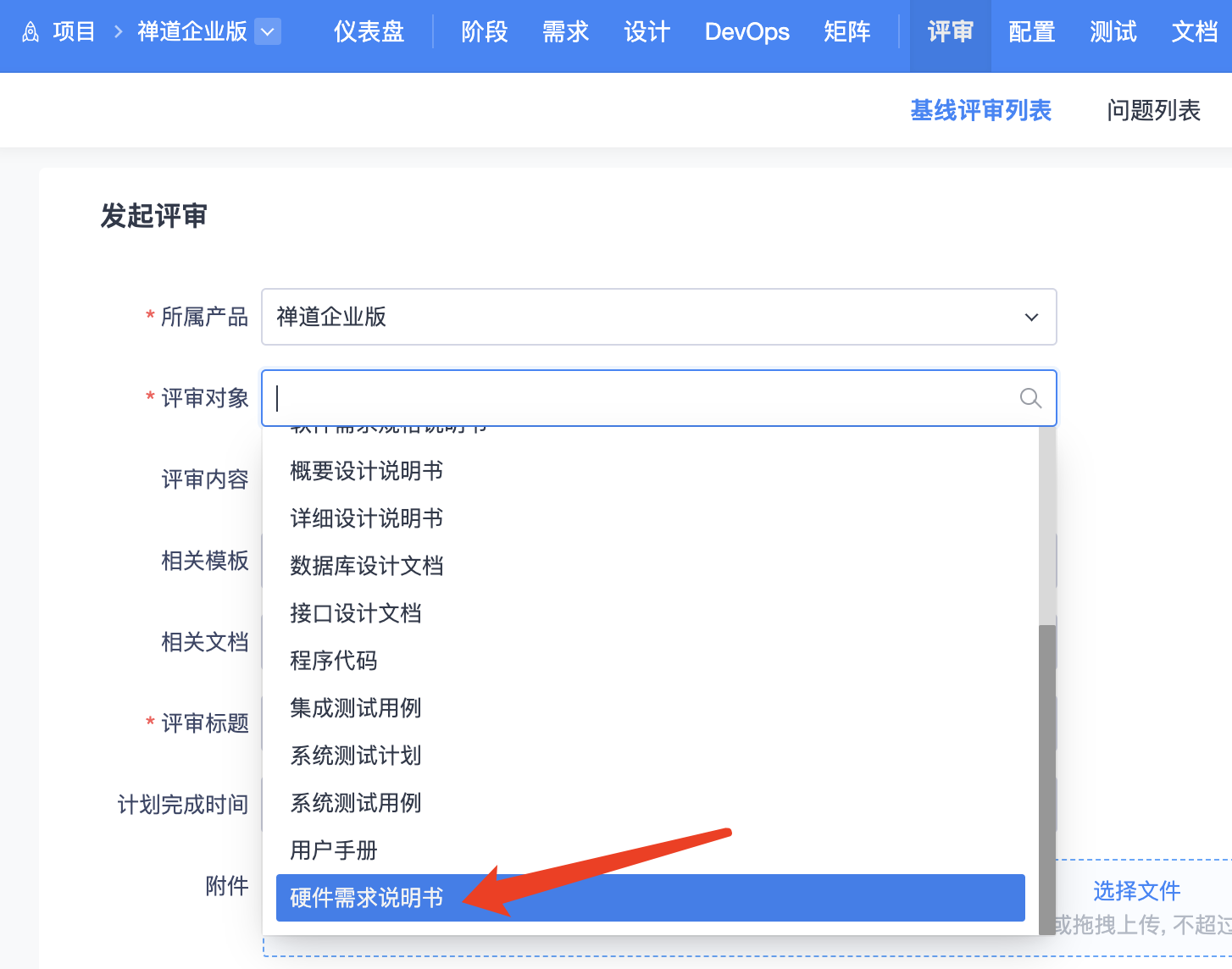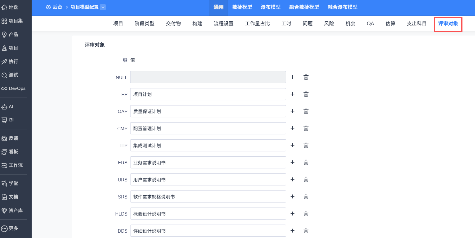 关于“评审对象”,除了禅道内置的选项,您还可以去“后台”--“项目模型配置”--“通用”--“评审对象”中,自定义新的评审对象。