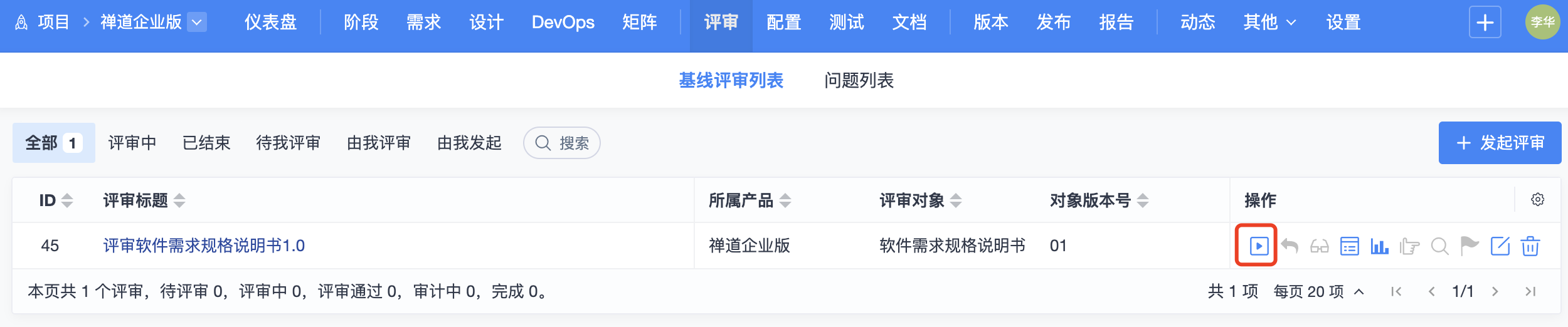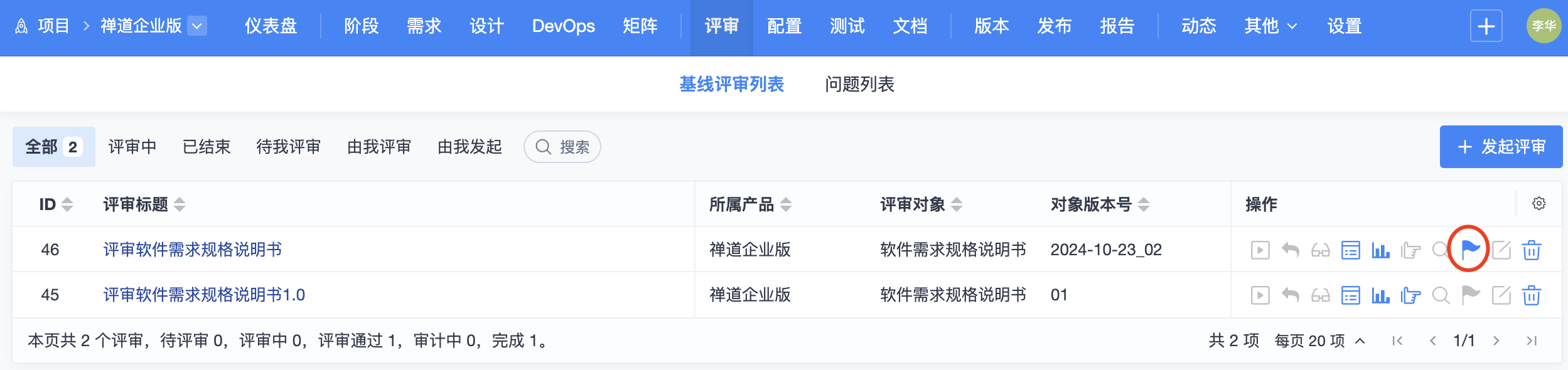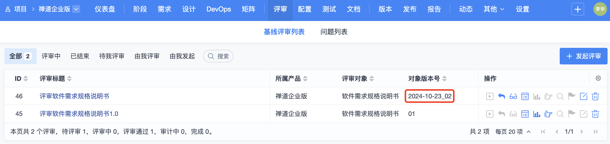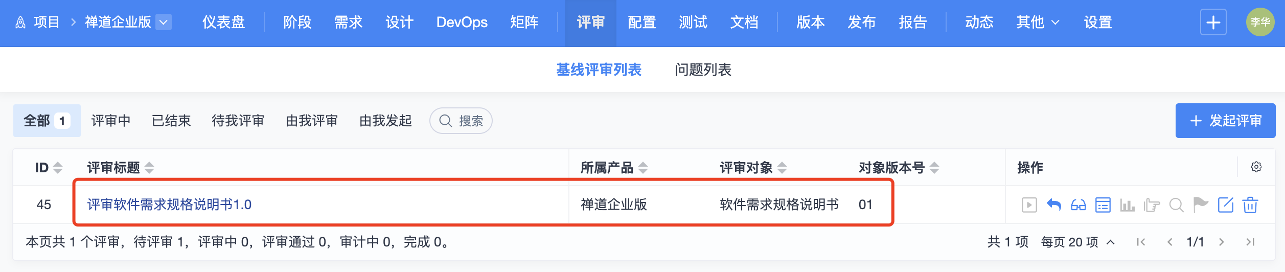 解决不符合项后,进入“基线评审列表”,再次发起评审。