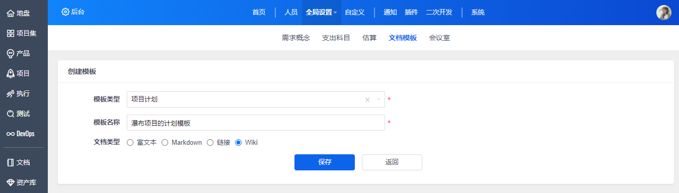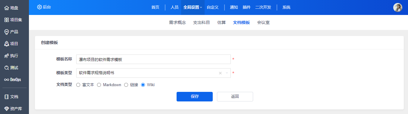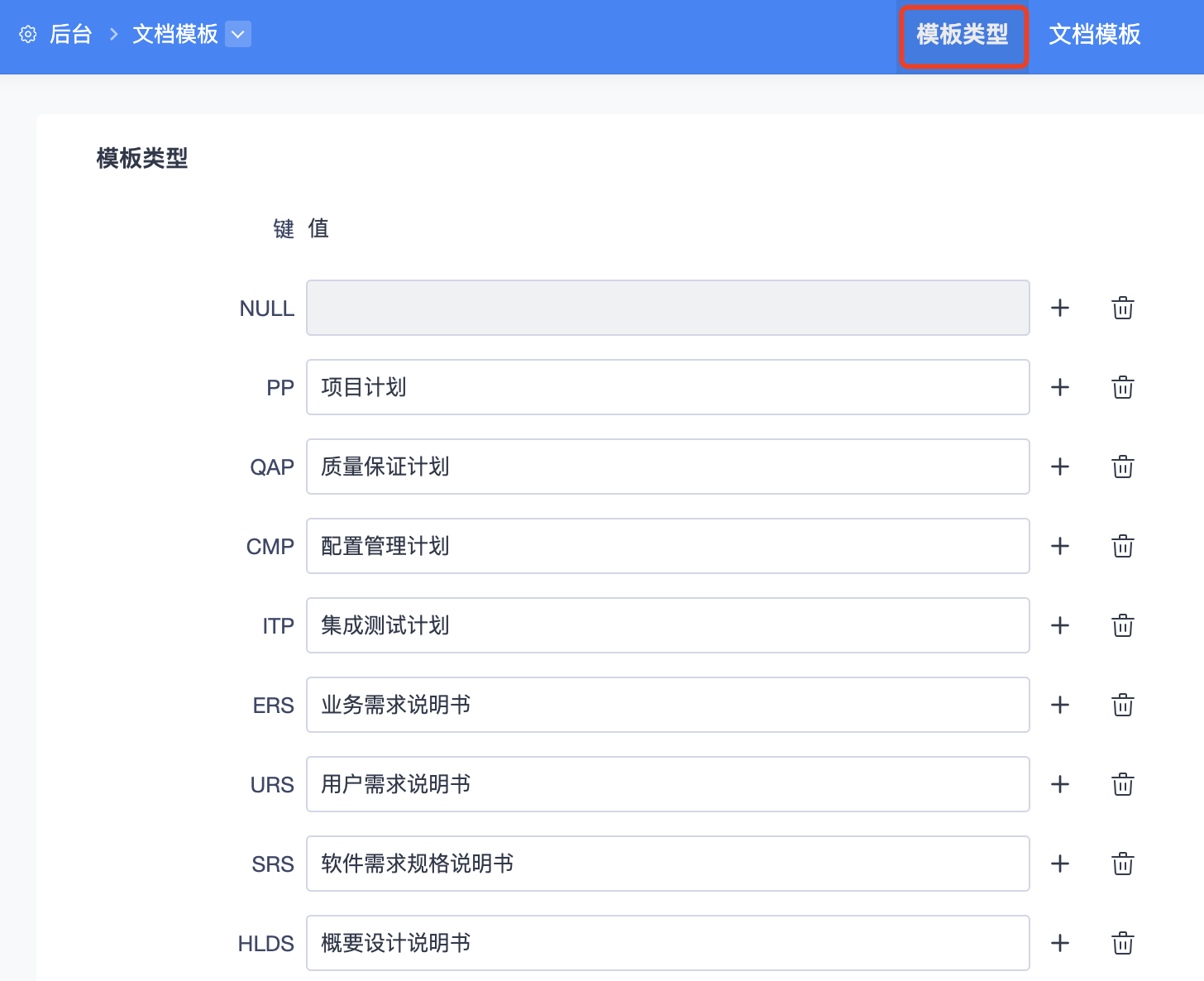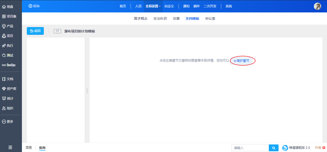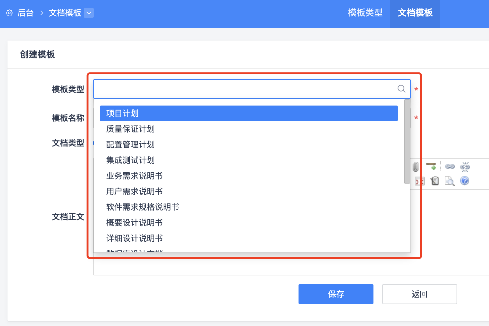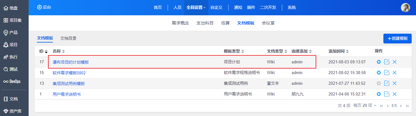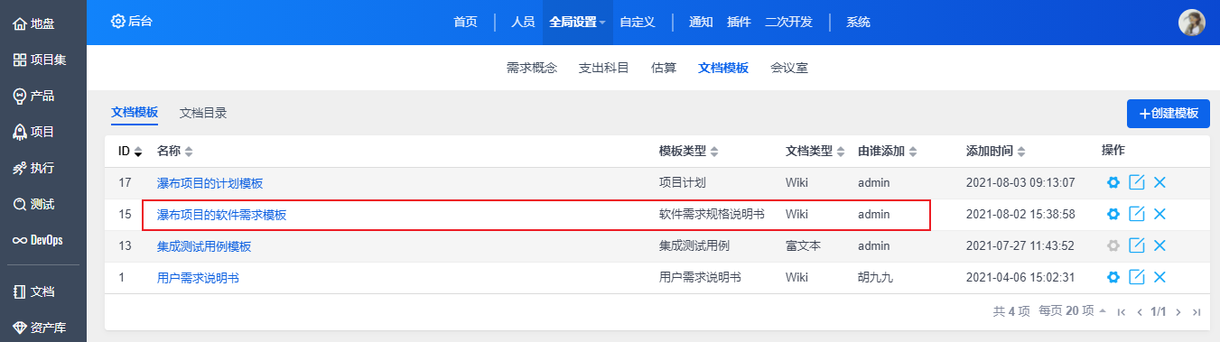 点击“后台”--“模型模型”,选择“瀑布模型”。在二级菜单中选择“评审”,可以看到左侧列出了系统中存在的模板。