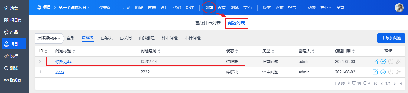 若审计没通过,需要去“评审”--“问题列表”更新问题状态,再次进行审计。