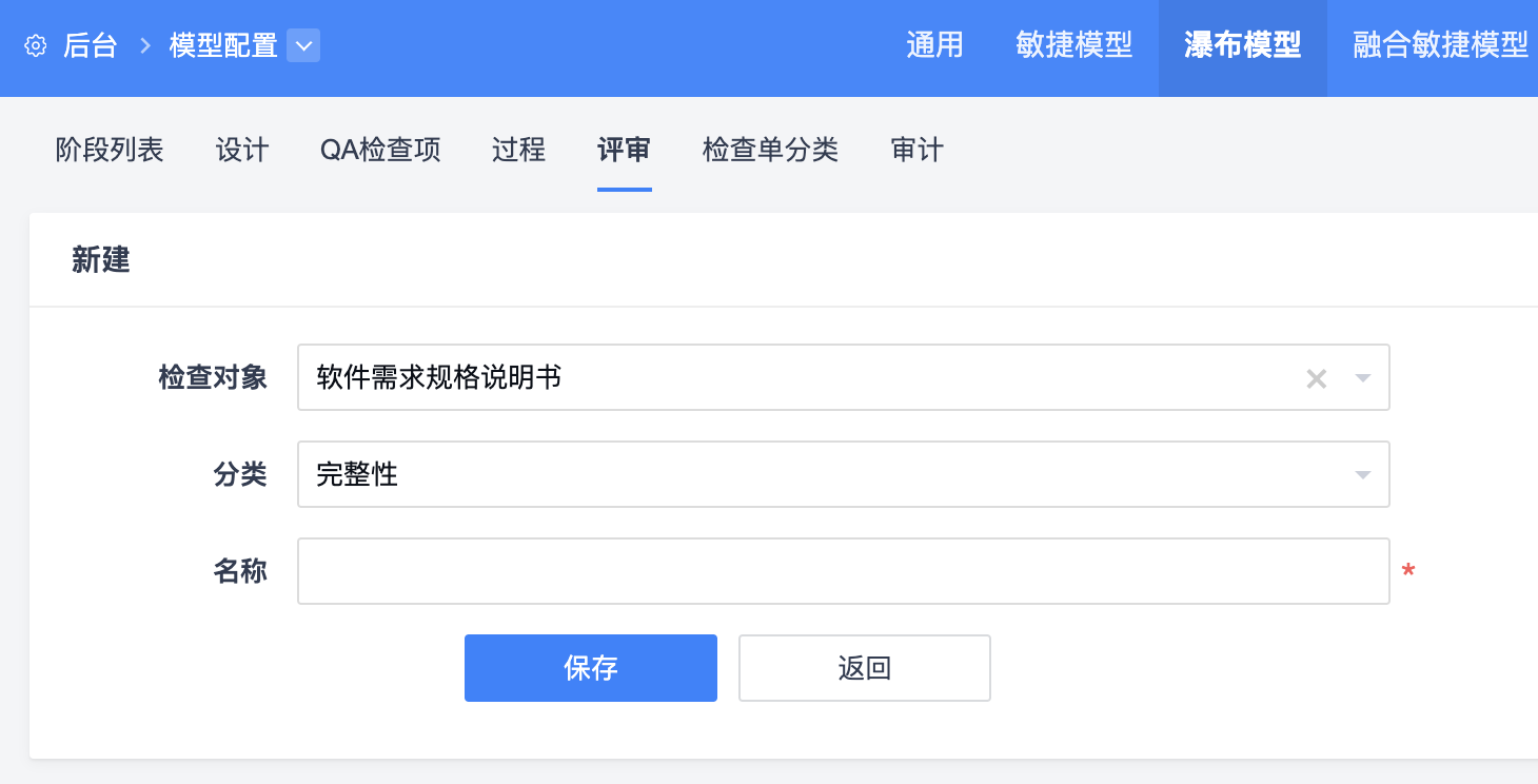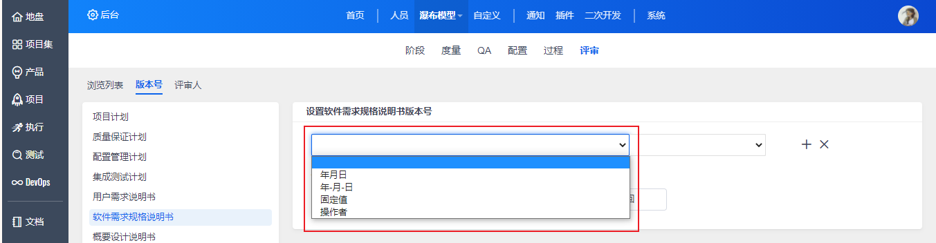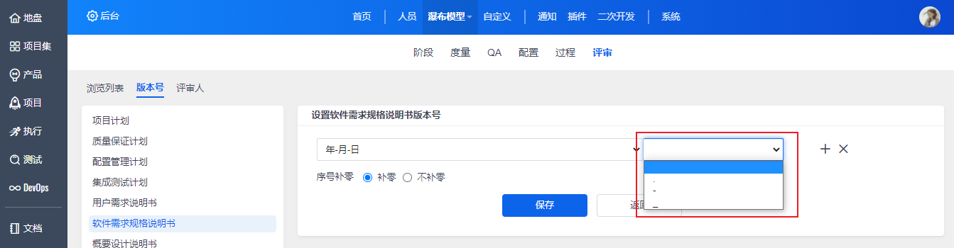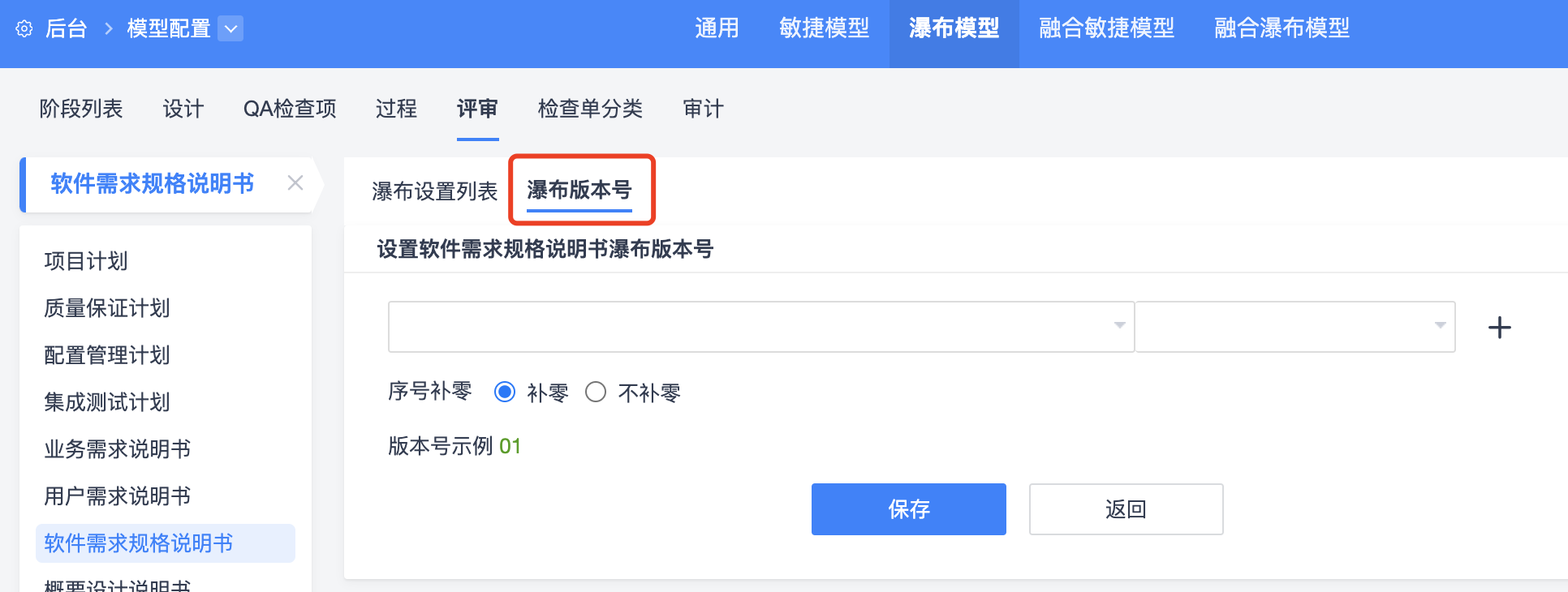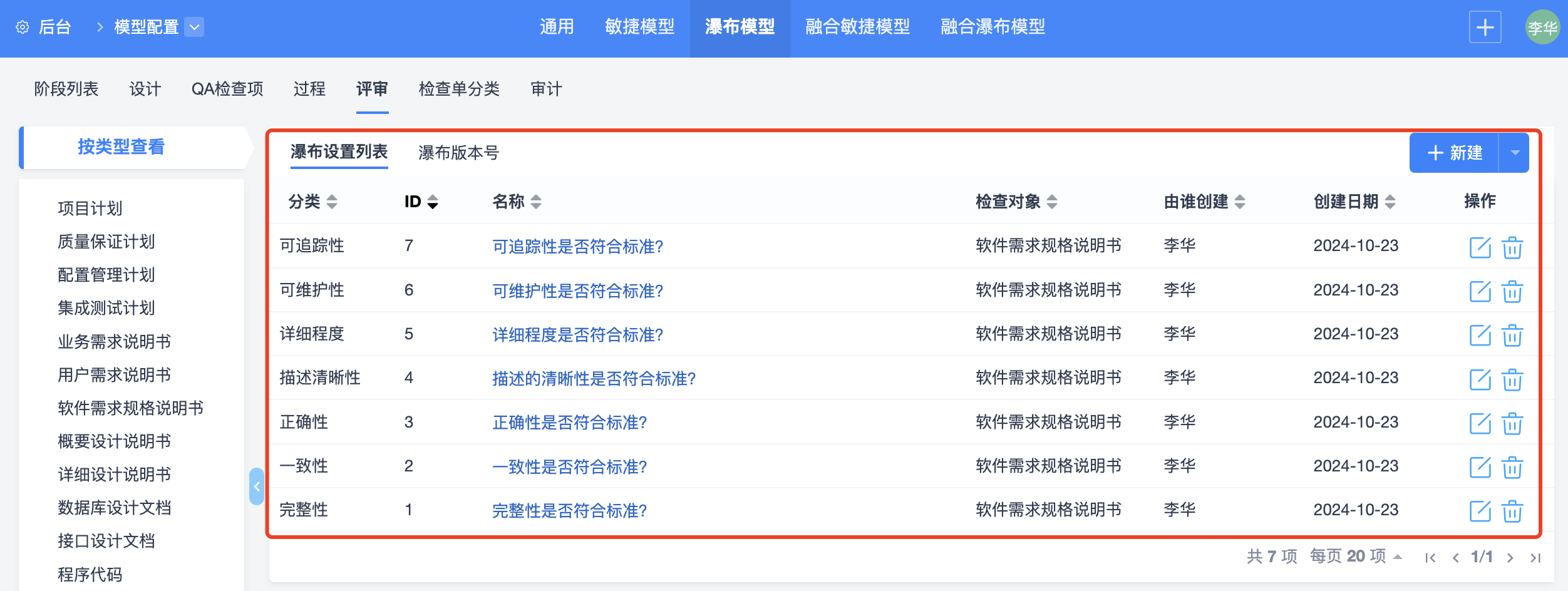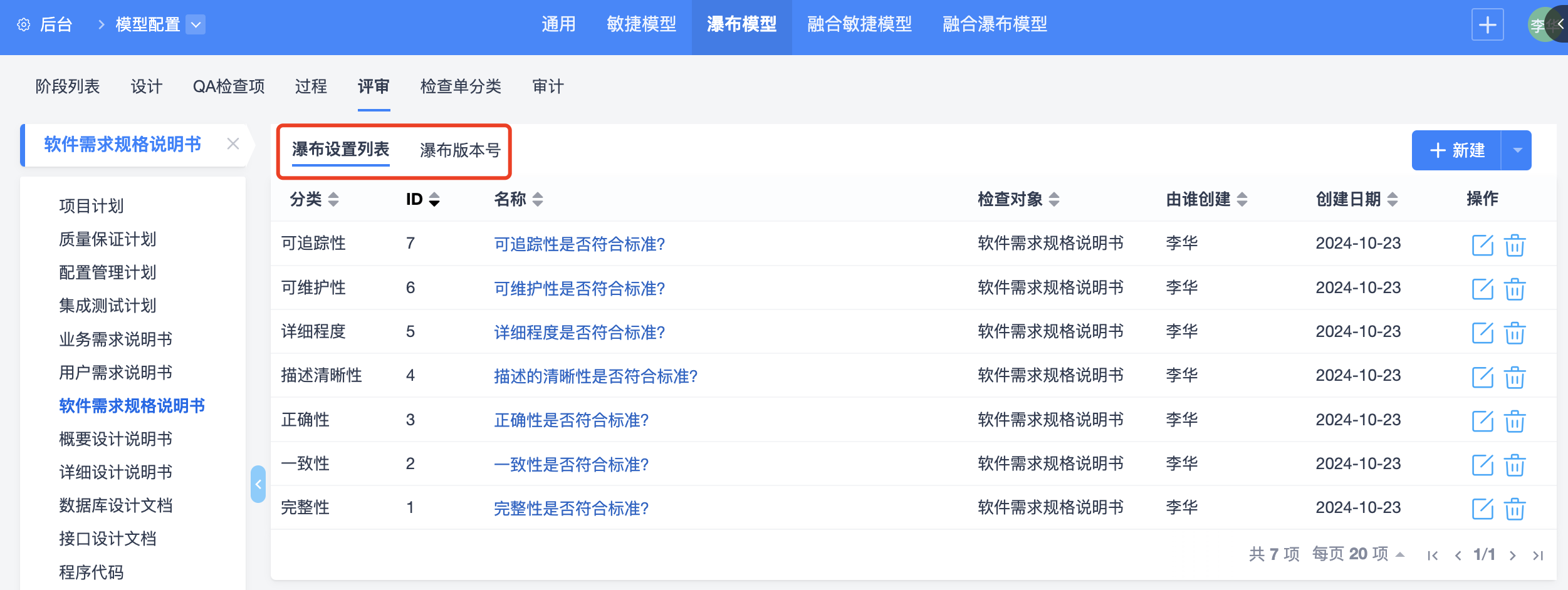 在后台--模型配置--瀑布模型--评审中,可以对基线评审对象添加检查清单、自定义版本号操作。
