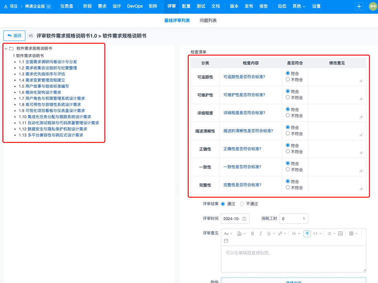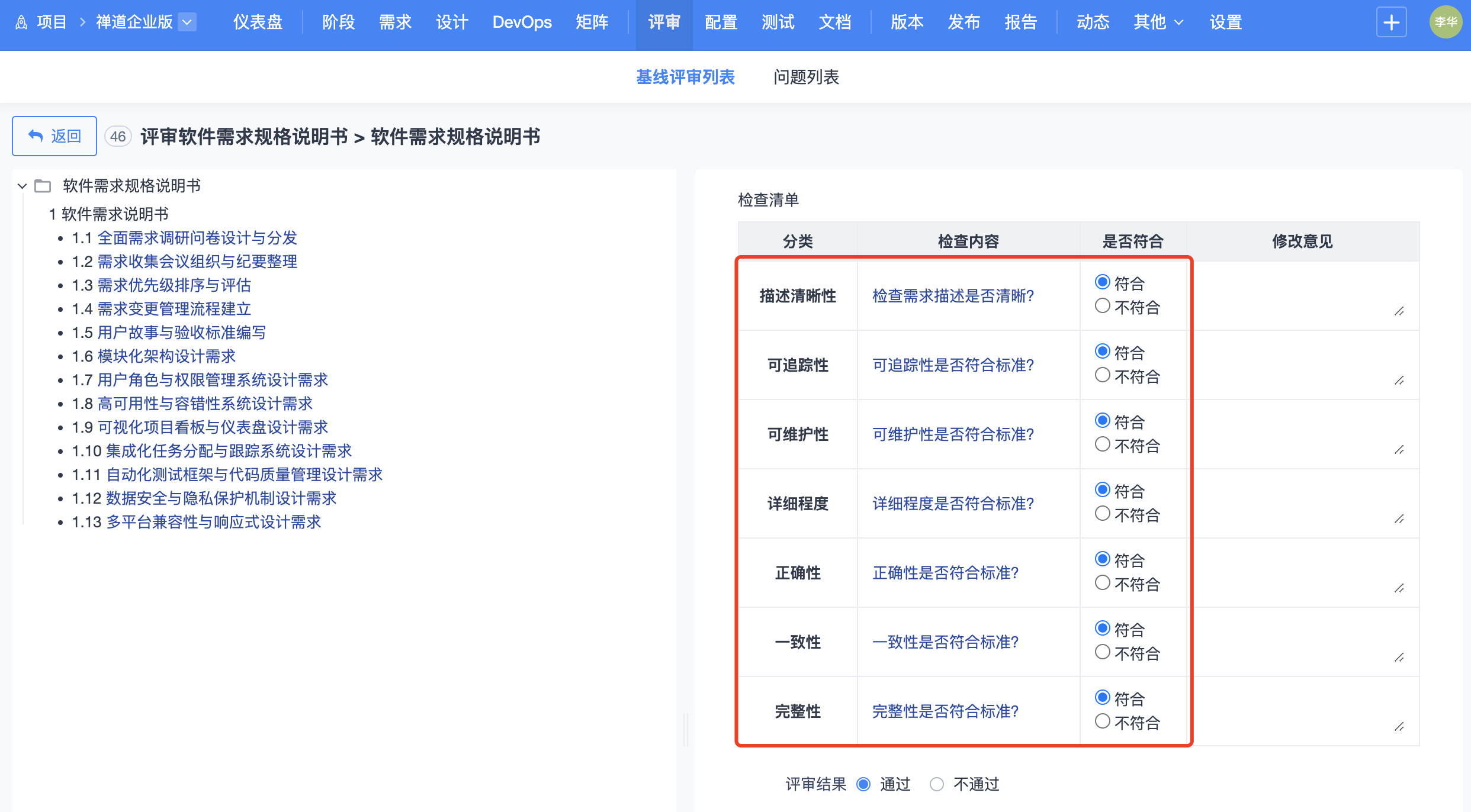 评审页面就可以根据检查清单的内容进行评估是否符合标准。