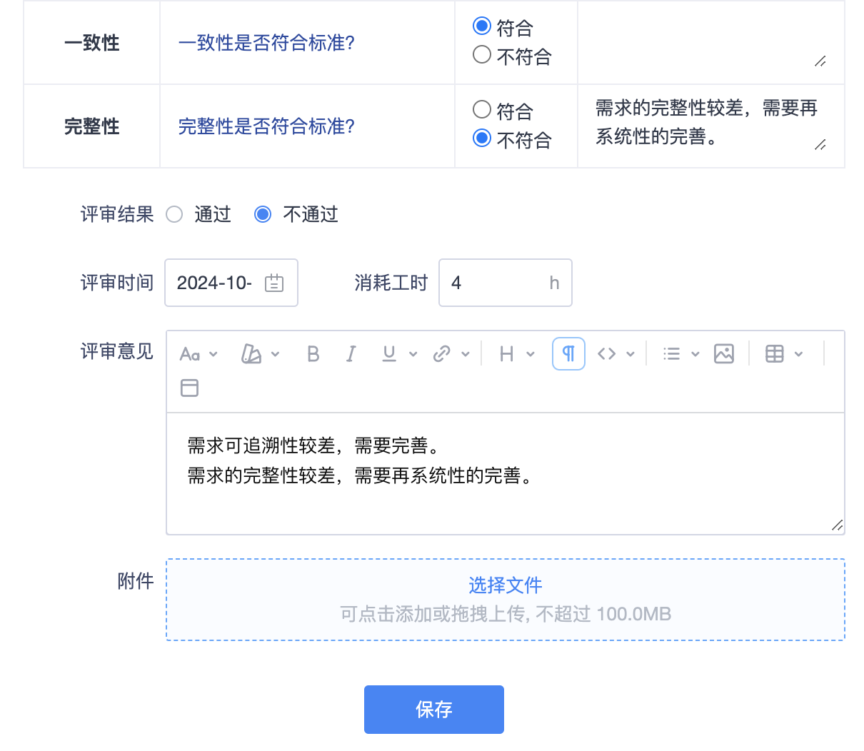 若无不符合项,点击“保存”,通过评审。若有不符合项,填写修改意见。
