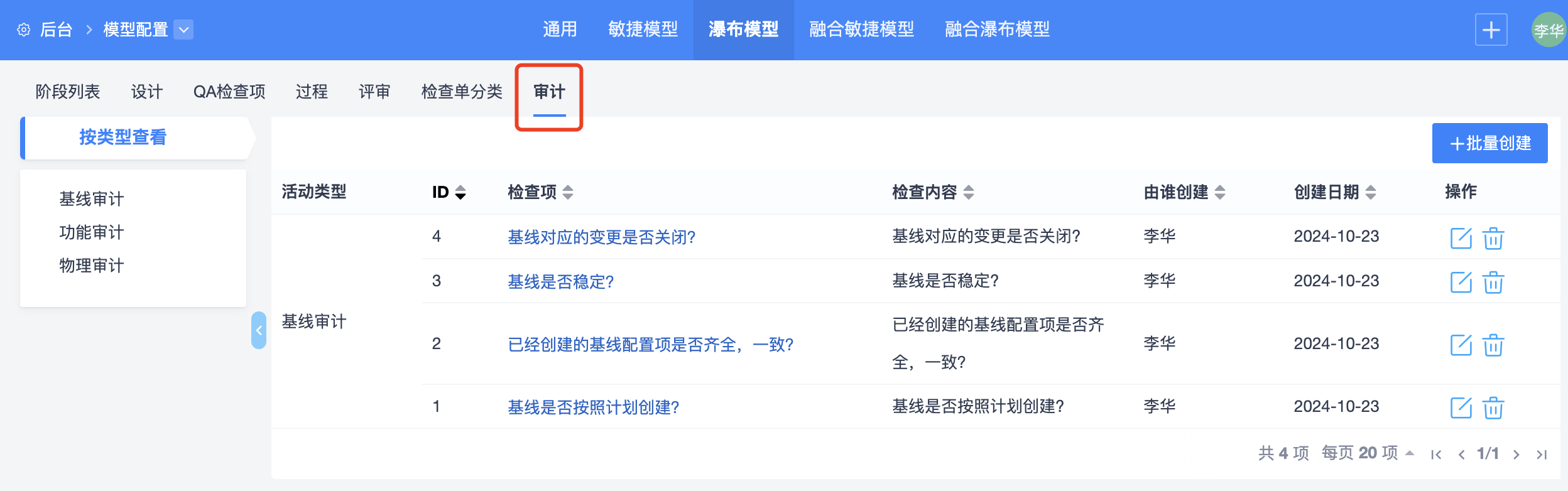 审计页面的“检查清单”在-“后台”--“模型配置”--“瀑布模型”--“审计”中设置。