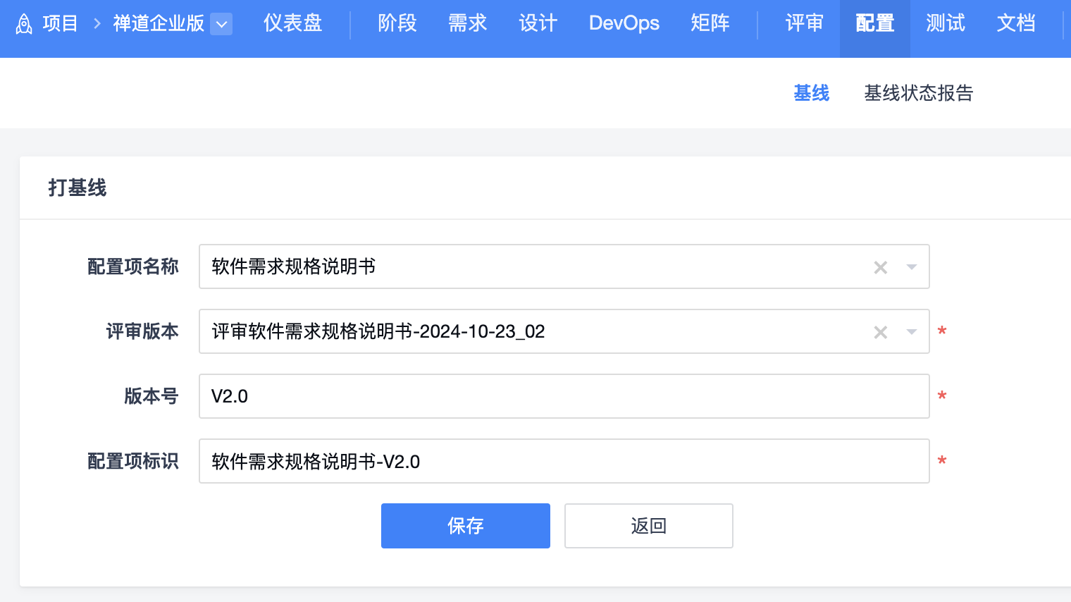 在打基线页面中可以对配置项设置版本号、配置项标识。