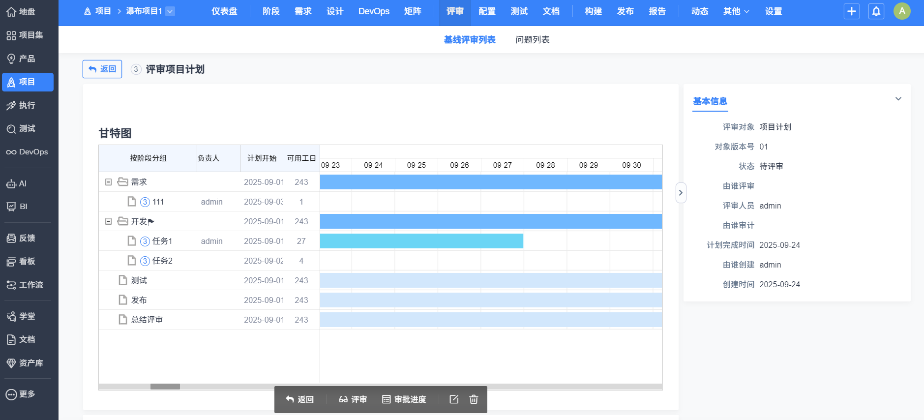 瀑布项目评审通过标准化流程对关键输入/输出物进行质量审核,记录并闭环处理不符合项,建立可追溯的受控基线,确保各阶段成果符合质量要求。该功能帮助企业构建严格的质量管控体系,使项目交付物经过充分验证,在保证合规审计要求的同时,实现高质量的项目成果交付。