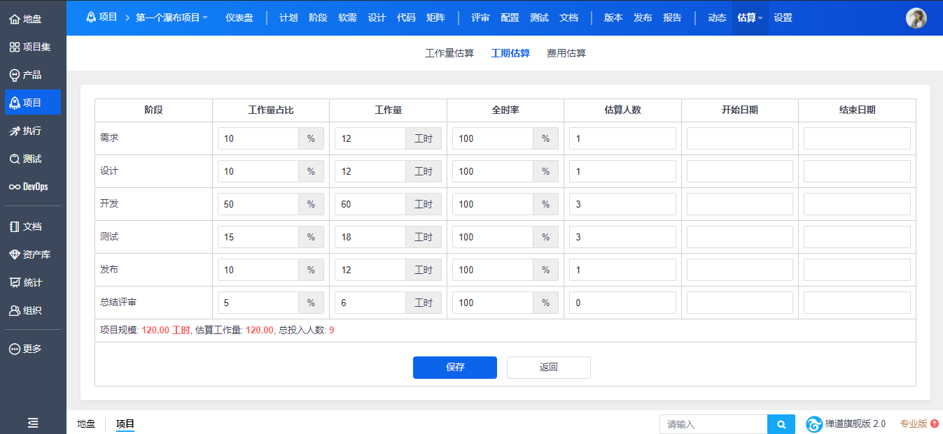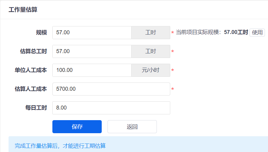 以估算单位为工时来统计,工作量估算中的规模也就是项目需求的总工时,可以自定义设置新的规模也可以使用项目实际的规模。