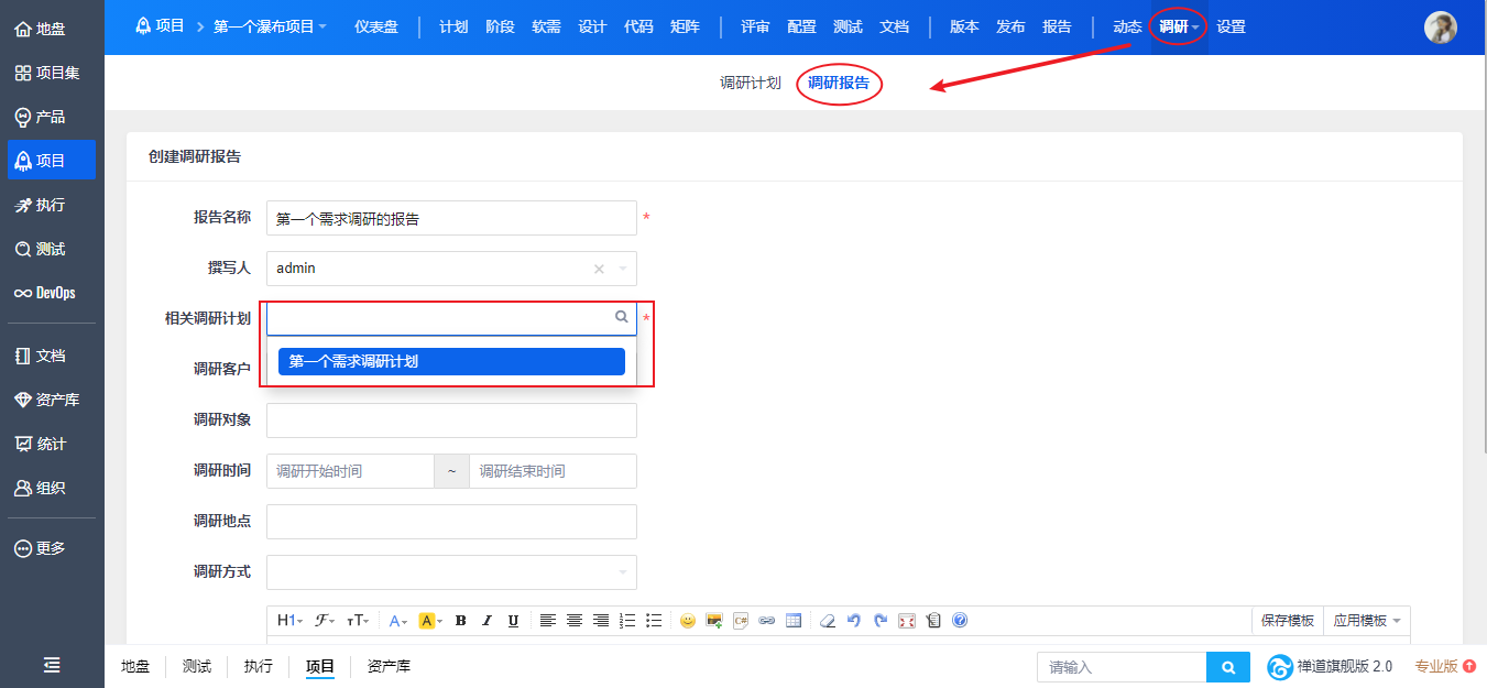 在产品模块下创建用户需求时,来源可以选择“调研报告”作为需求的来源,调研报告下拉框将显示所有的调研报告。