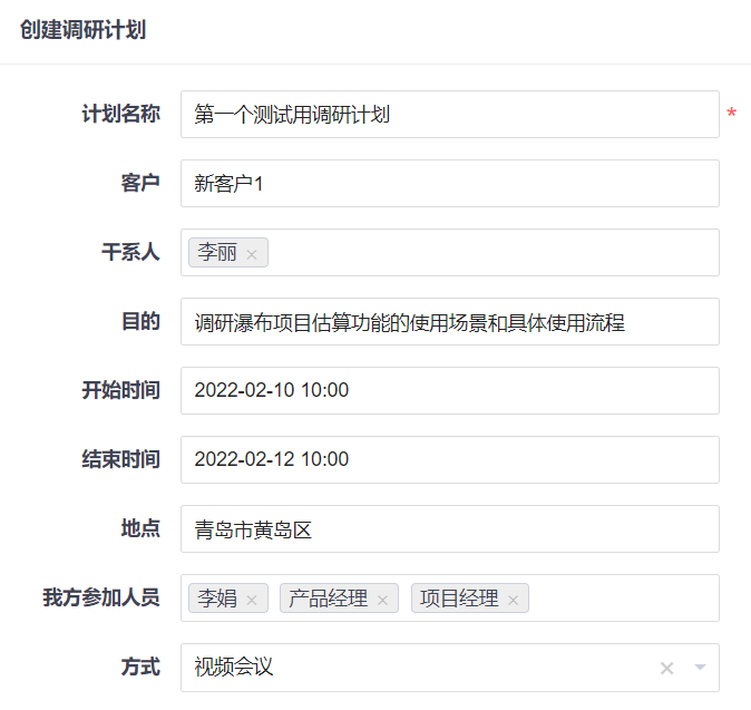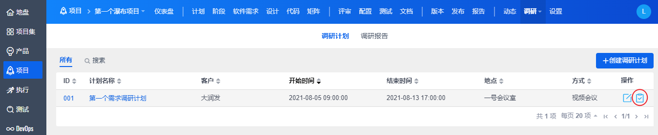 点击“项目”-“其他”-“调研”-“创建调研计划”。