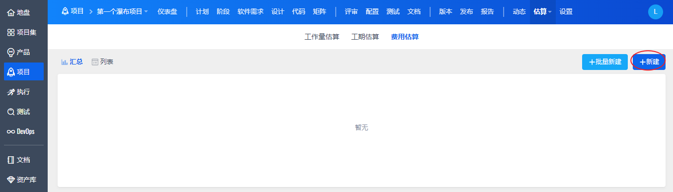 点击“项目”,选择你的项目,然后点击“其他”--“估算”。进入“工作量估算”。