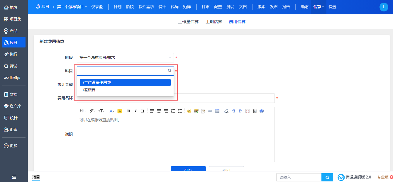 在进行费用估算前,需要到后台--全局设置--支出科目里添加维护支出科目。