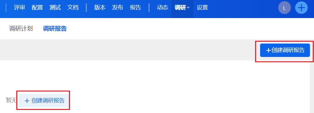 可以在调研报告列表里点击创建调研报告按钮来创建调研报告。