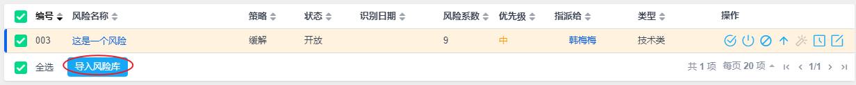 和项目中的问题一样,可以添加到风险,并导入资产库--风险库中进行管理。