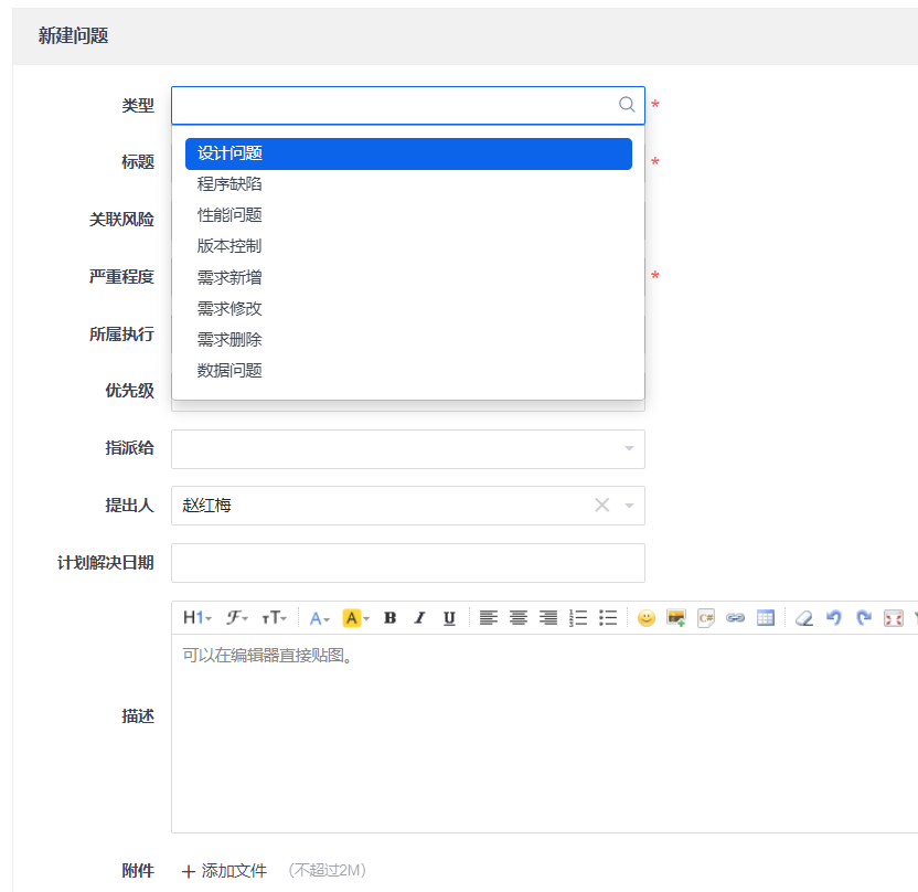 问题的类型包括:设计问题、程序缺陷、性能问题、版本控制、需求新增、需求修改、需求删除、数据问题等。