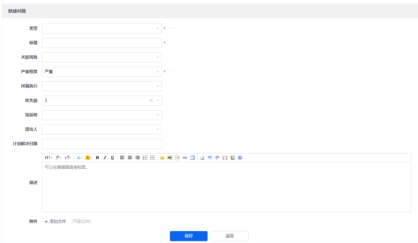 - 类型:技术类、管理类、业务类、需求类、资源类、其他