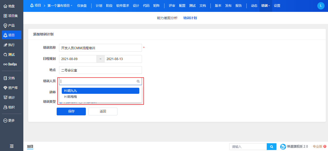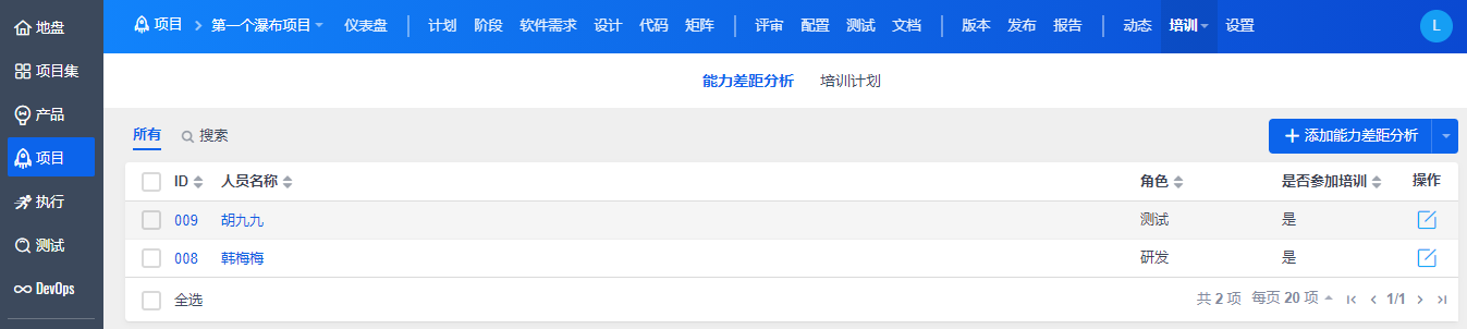 通过培训功能,可以针对项目开发需求进行能力差距分析,制定项目培训计划,填写培训总结。