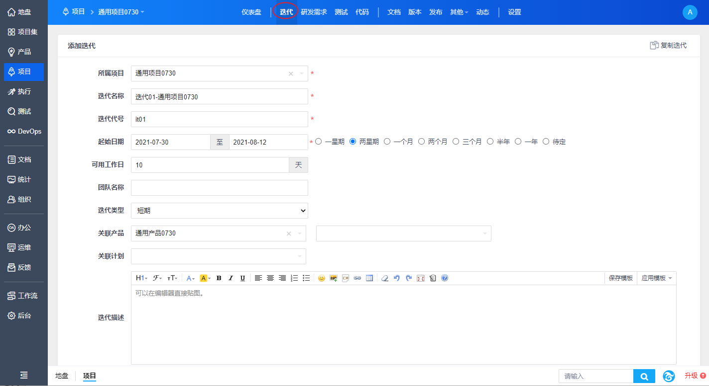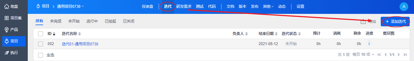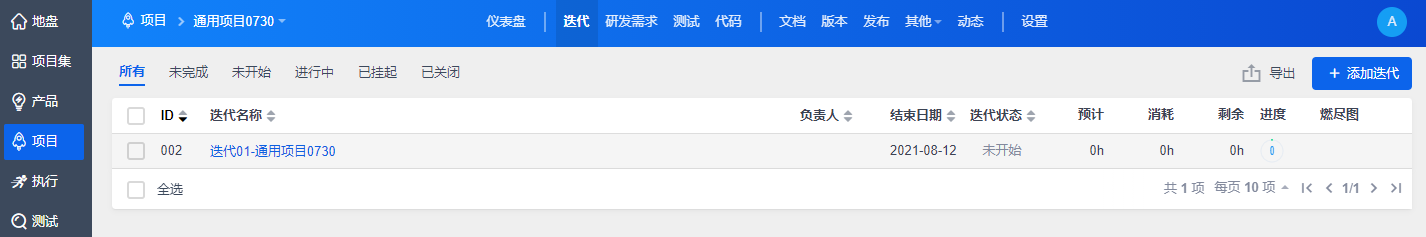 创建了项目后,我们就可以添加执行,设置团队、关联需求、分解任务,进行正常的研发工作了。