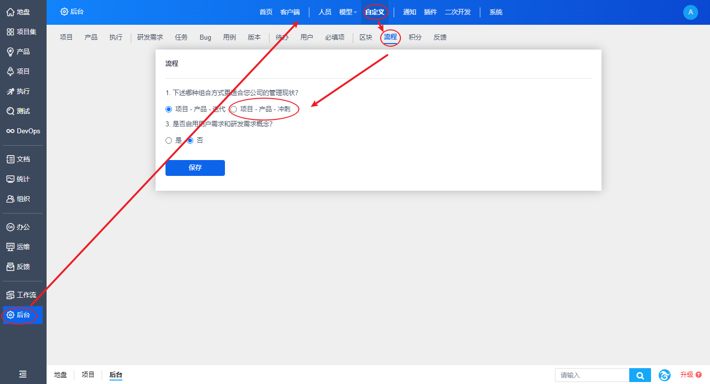 - 如果你在“后台”-“自定义”-“流程”中,将管理流程设置为“项目-产品-冲刺”,那么你再上述页面看到的将是“冲刺”,而不是“迭代”。