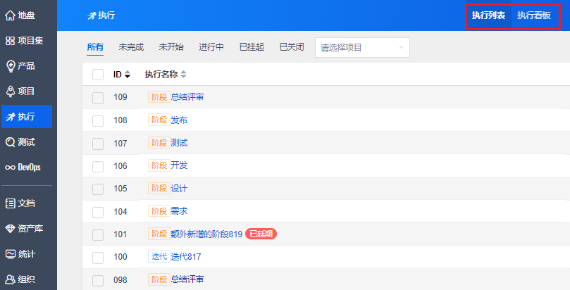 - 执行看板列出进行中的项目下的执行的状态和进度。