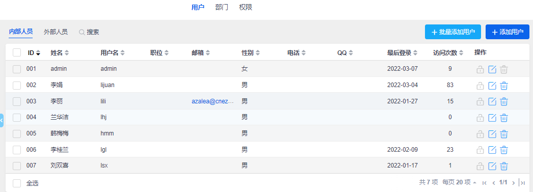 点击后台首页中的“人员管理”进入人员管理页面,进行人员,部门和权限的维护。